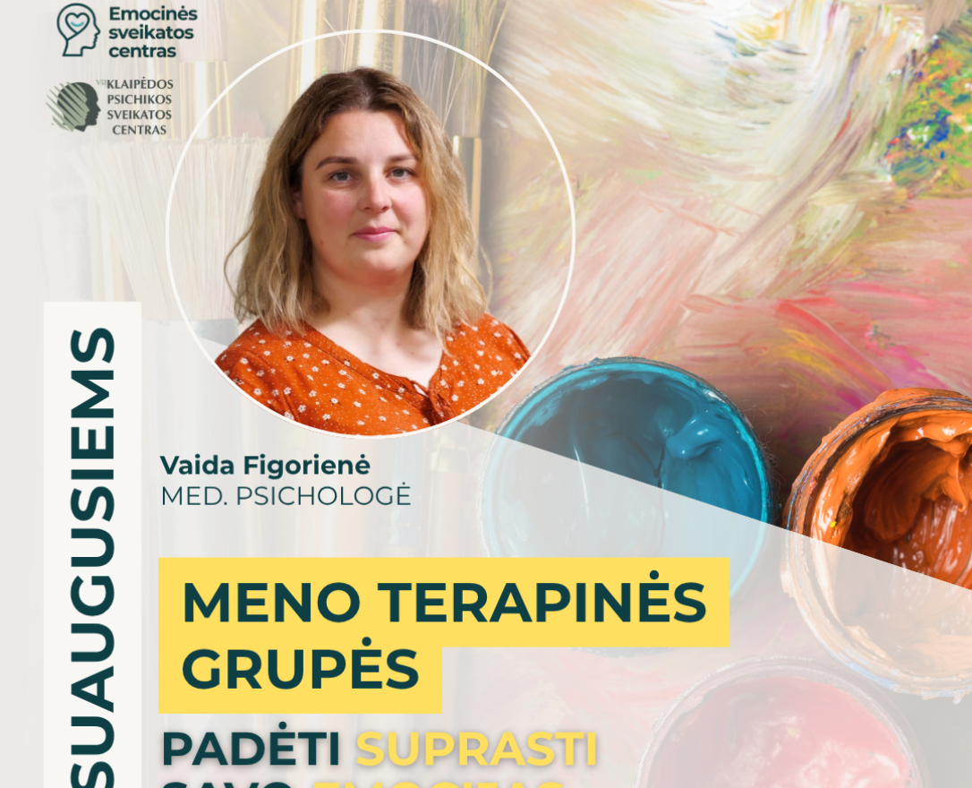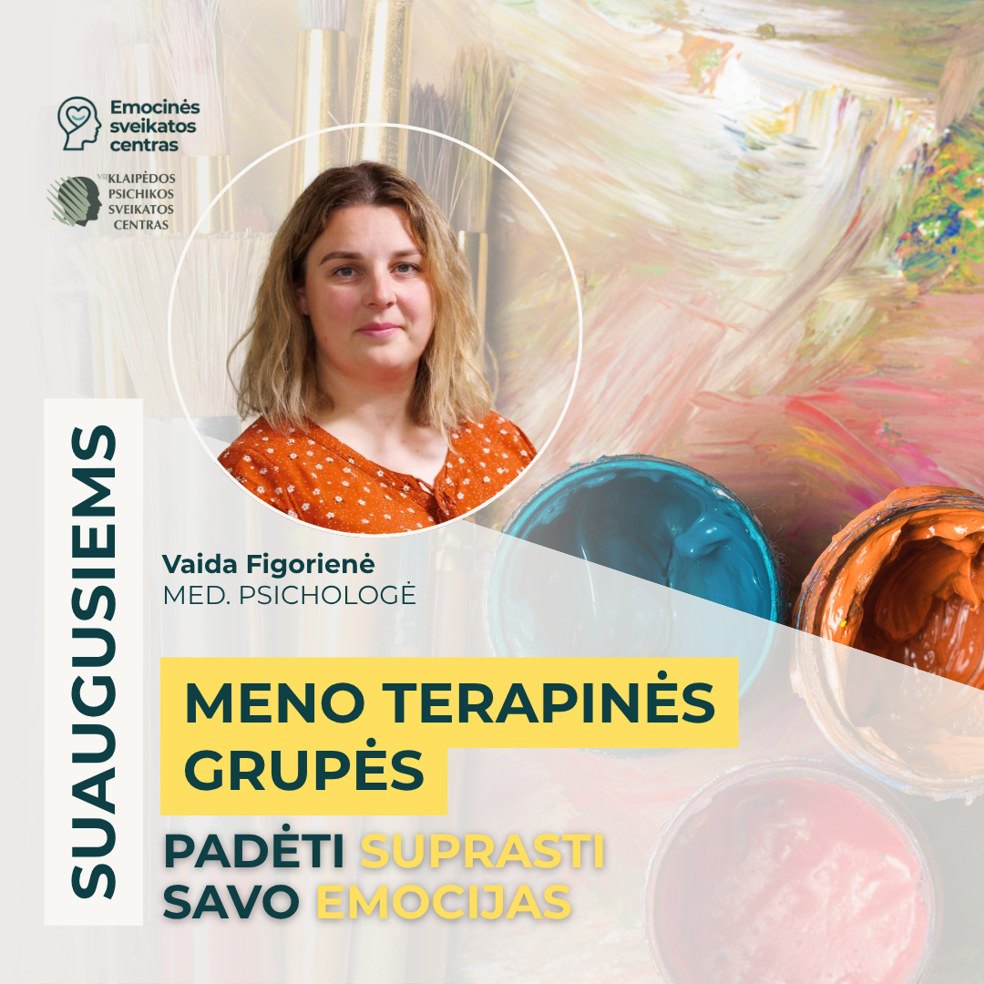 Kviečiame prisijungti prie meno terapijos grupių, skirtų suaugusiesiems, patiriantiems emocinių sunkumų – nerimą, įtampą, emocinį nuovargį, depresiją ir kt. Grupės paremtos meno terapijos metodika. Užsiėmimų metu skiriamas dėmesys emocijų pažinimui, refleksijai, įtampos mažinimui bei vidinių resursų stiprinimui.