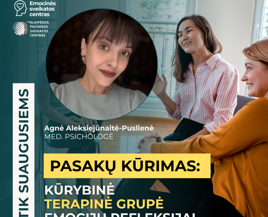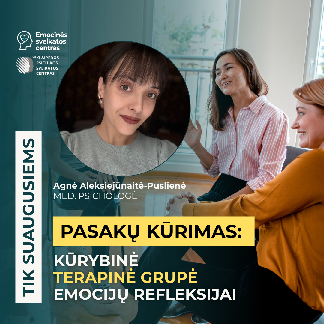 Tai grupiniai užsiėmimai, kuriuose per pasakas, metaforas ir simbolius tyrinėjami vidiniai išgyvenimai, emocijos ir patirtys. Kuriama saugi erdvė refleksijai, savęs pažinimui ir bendrystei.